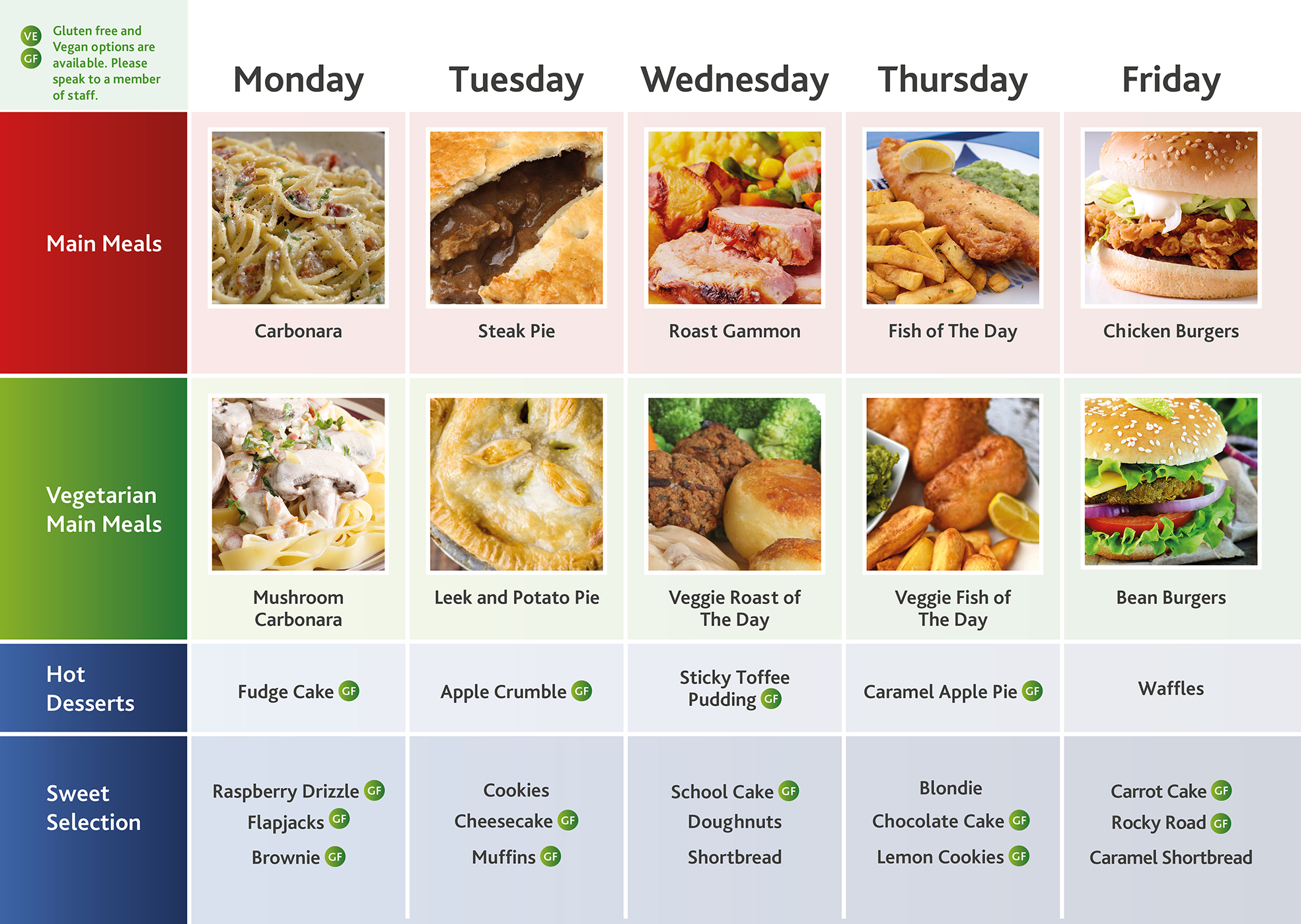 - Gluten free and vegan options for mains and desserts are available daily