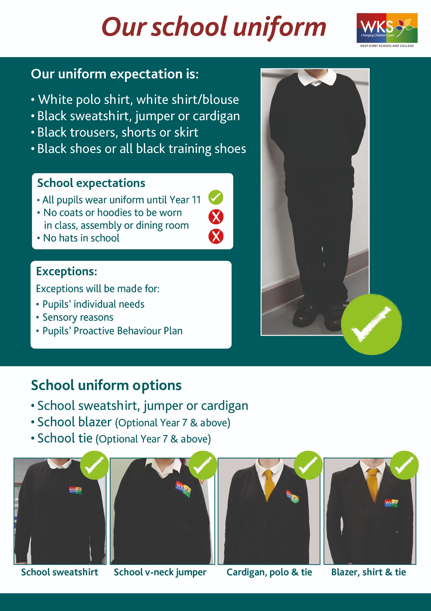 At West Kirby School and College, we believe that our uniform is essential to the ethos of our school community as it establishes a clear sense of identity and fosters a sense of inclusive belonging. We are proud it has been developed together with our pupils and we are happy to accommodate pupils' sensory needs.